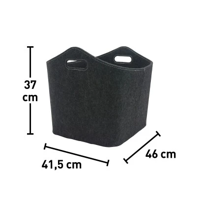 Der FIREFIX Filzholztrage hat eine eckige Form. Sie ist oben 46 x 41 cm breit bzw. tief. Das Material ist schwarz. Sie hat zwei Handgriffen für die einfache Verwendung.