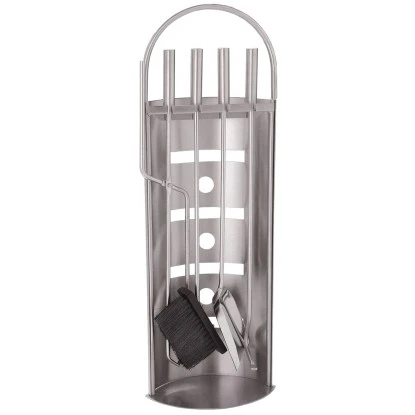 Das edle Kaminbesteck aus matt gebürstetem Edelstahl besteht aus Schaufel, Besen, Zange und Schürhaken.