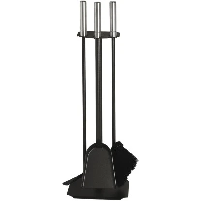 Das Kaminbesteck in modernem Design passt gut zu fast jeder Wohnzimmereinrichtung. Sowohl das Besteck selbst als auch die Halterung bestehen aus schwarz beschichtetem Metall. Besen, Schaufel und Schürhaken verfügen über Griffe aus Edelstahl, die das elegante Design des Kaminbestecks abrunden.
